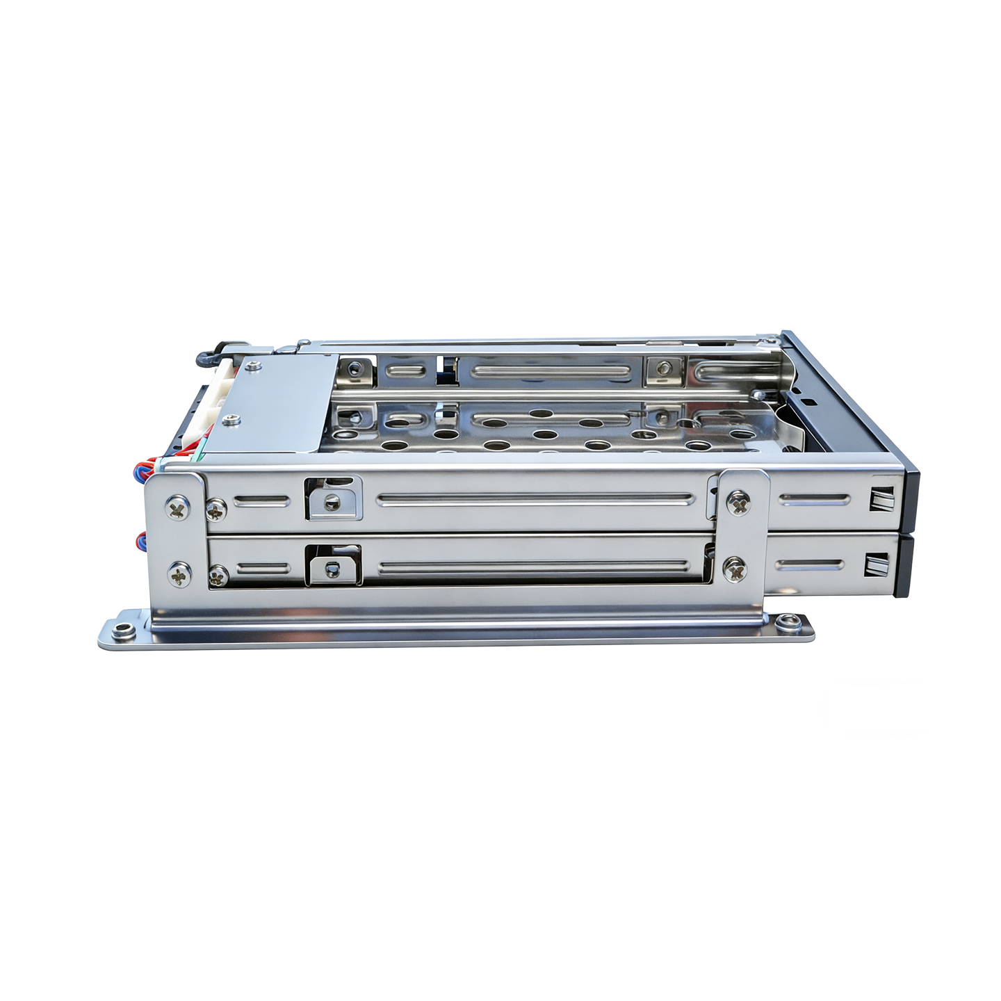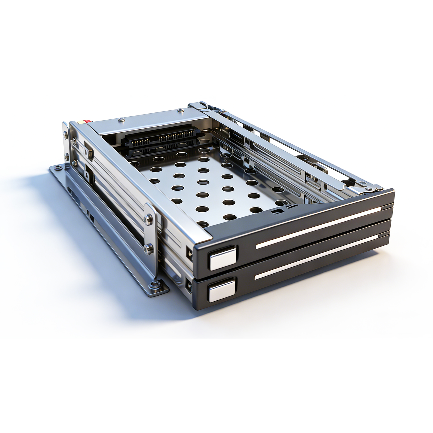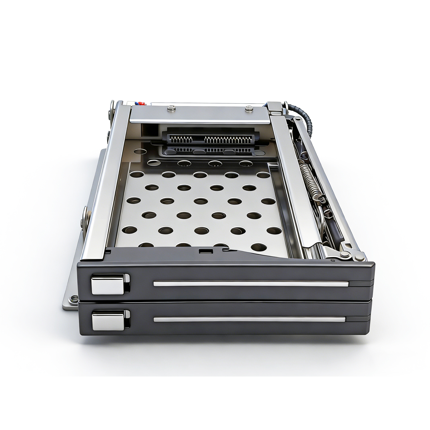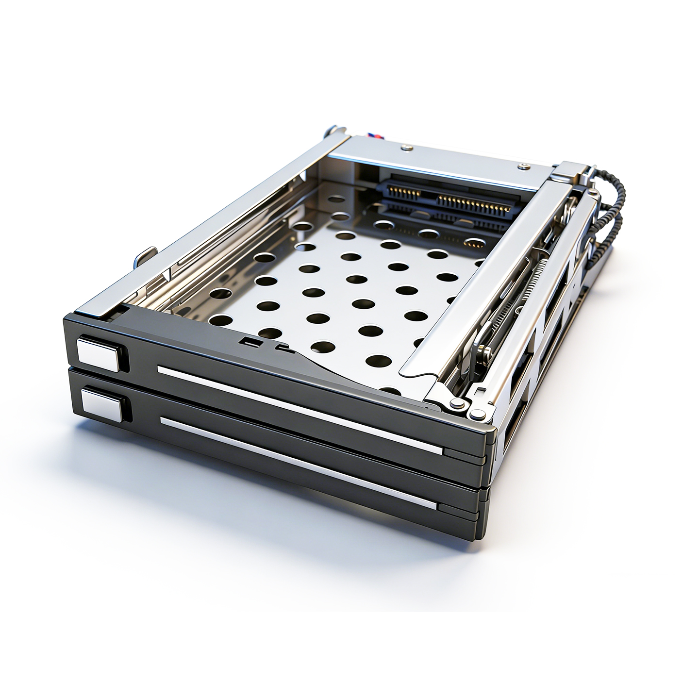 Этот мобильный рекорд поддерживает до двух 2,5-дюймовых SATA SSD/HDD и совместим с дисками высотой от 5 до 9,5 мм. Серебристая кнопка переключения на передней панели обеспечивает простой, плавный и надежный способ извлечения диска, что делает весь процесс замены более эффективным и беспроблемным.